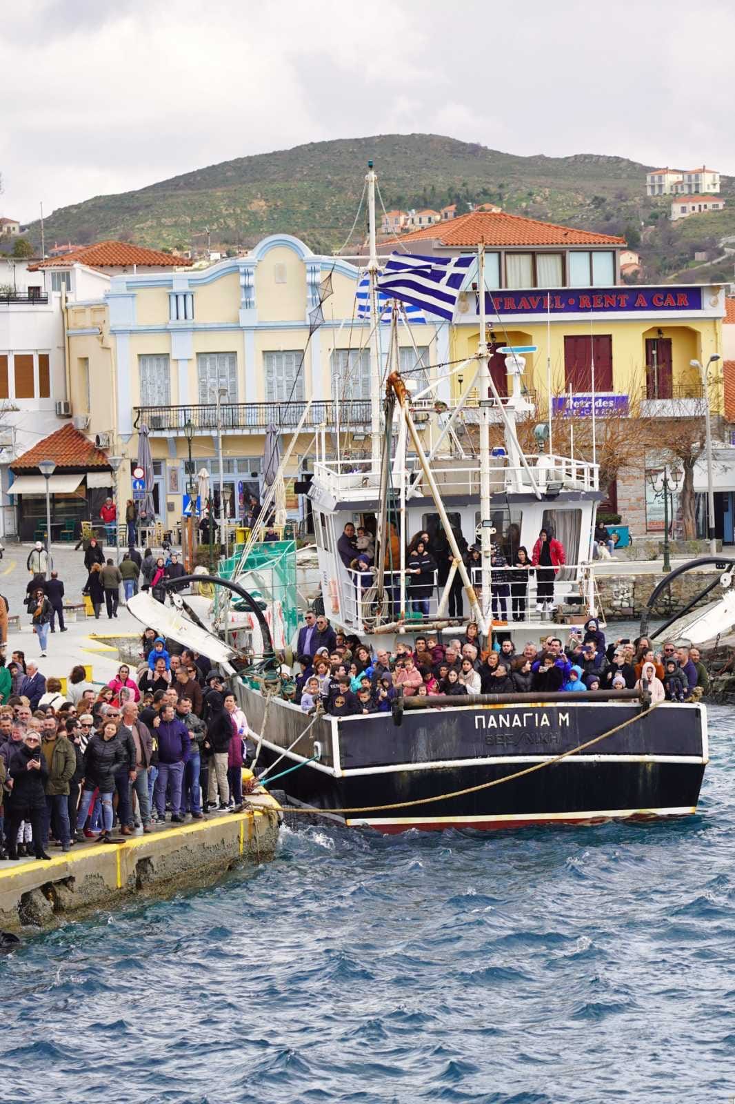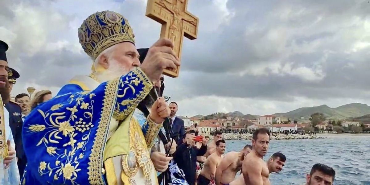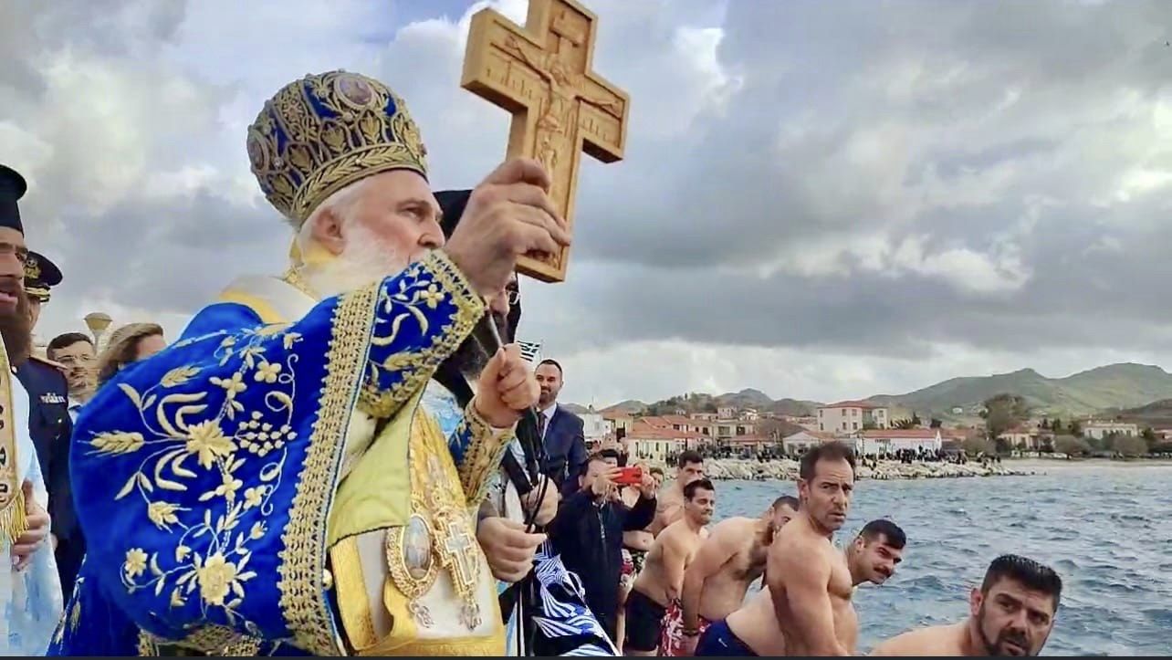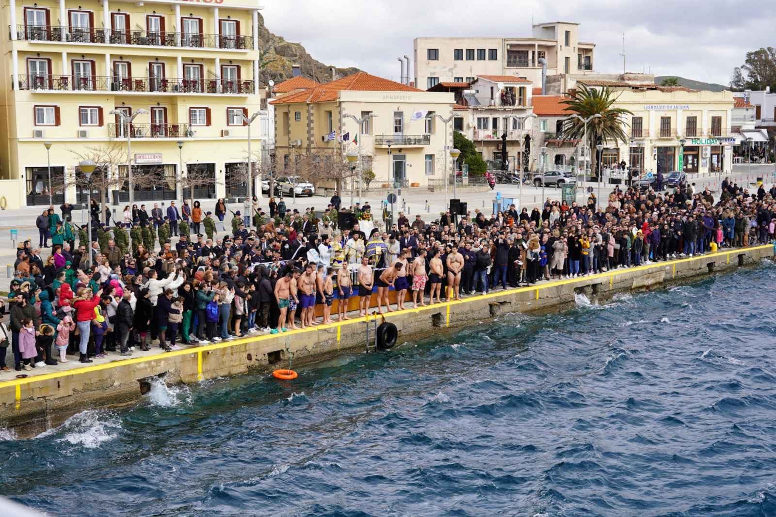 Στο τέλος της λατρευτικής σύναξης τελέσθηκε η ακολουθία του Μεγάλου Αγιασμού, ενώ στη συνέχεια σχηματίστηκε λιτανευτική πομπή, με την συνοδεία της φιλαρμονικής του Στρατού και του Δήμου, προς το κεντρικό λιμάνι της Μύρινας, όπου πραγματοποιήθηκε ο καθαγιασμός των υδάτων. Πολλοί νέοι έπεσαν στην θάλασσα, αψηφώντας τα παγωμένα νερά, για να τηρήσουν το παραδοσιακό έθιμο και να ανασύρουν τον Τίμιο Σταυρό για τον αγιασμό της ζωής τους.