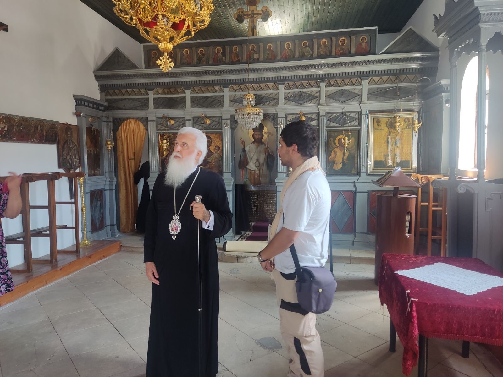 Είχε την ευκαιρία, ακόμη, στα πλαίσια της ποιμαντικής του ευθύνης, εκτός της συνεργασίας του με τον Εφημέριο του νησιού για ενοριακά θέματα, να συναντηθεί και να συνεργαστεί και με τον νέο Δήμαρχο του Αγίου Ευστρατίου κ. Κων/νο Σινάνη, ο οποίος υποδέχθηκε, μαζί με τον Εφημέριο, τον Σεβασμιώτατο στον λιμένα του νησιού. Ο κ. Δήμαρχος μέσα σε άλλα συνόδευσε τον Σεβασμιώτατο στο απόμακρο και ερημικό σπήλαιο της ασκήσεως του Οσίου Ευστρατίου, και τον ξενάγησε στις εγκαταστάσεις, οι οποίες χαρακτηρίζουν τον Άγιο Ευστράτιο πρωτοπόρο ως “πράσινο νησί”, και εκεί οι υπεύθυνοι αναφέρθηκαν αναλυτικά στον τρόπο λειτουργίας του σημαντικού εγχειρήματος, τους αξιόλογους στόχους του και την δυνατή ωφέλεια που προκύπτει για τους κατοίκους.