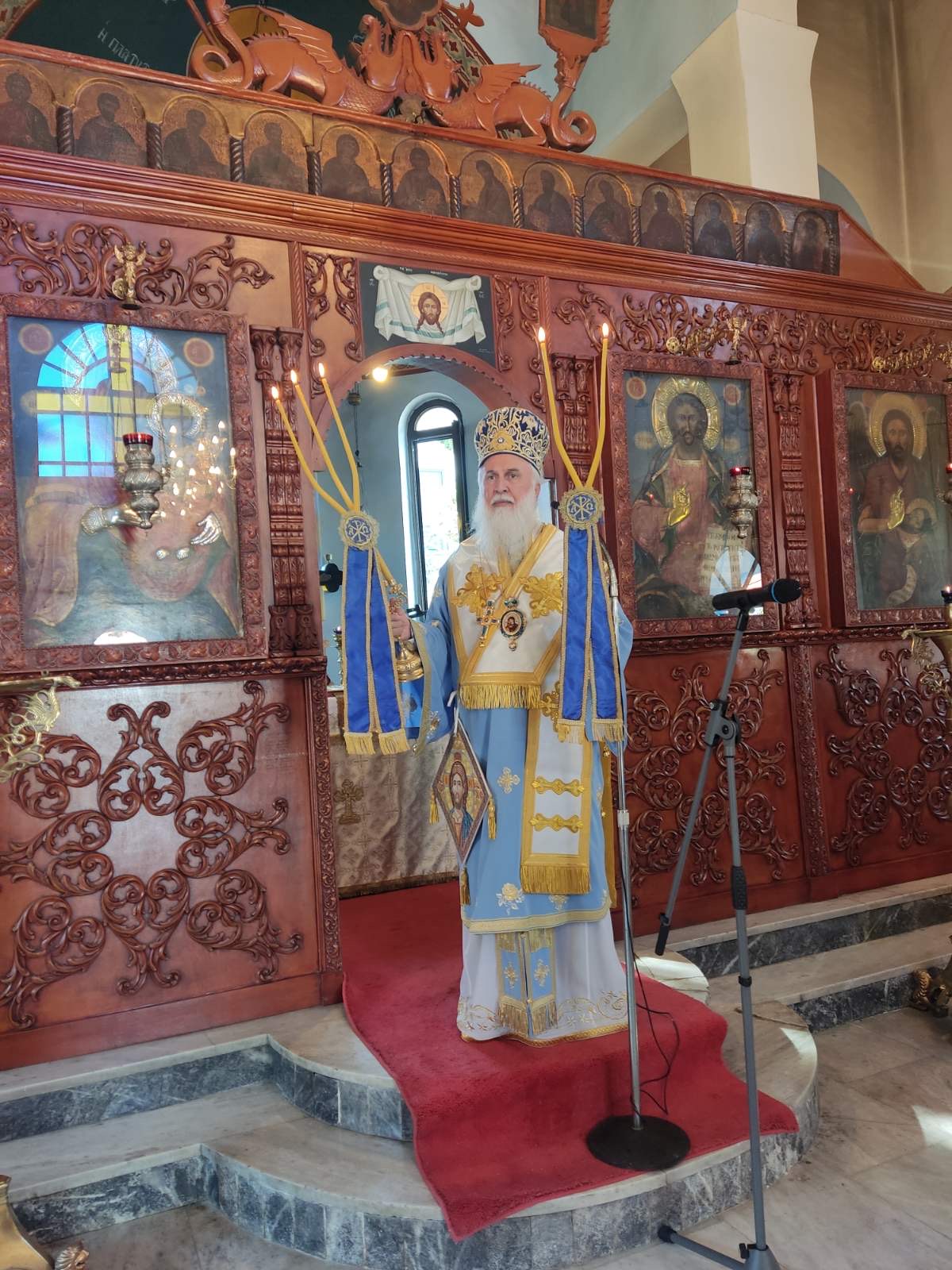 Το πρωί χοροστάτησε στον όρθρο και προεξήρχε στην πανηγυρική Θεία Λειτουργία, στης οποίας το τέλος μίλησε στους πιστούς για την σημασία του φωτός, που έλαμψε στο Θαβώρ κατά την Μεταμόρφωση του Σωτήρος, αλλά και στην αναγκαιότητα εκούσιας μετοχής μας σε αυτό το υπερκόσμιο Φως, που μπορεί να διαλύσει τα πυκνά σκοτάδια της καθημερινότητάς μας.