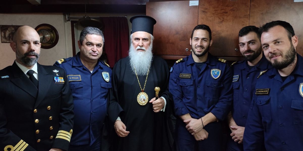 Ο Κυβερνήτης, αφού ευχαρίστησε εκ μέρους όλου του πληρώματος τον Σεβ. Ποιμενάρχη μας για την επίσκεψη, τον βεβαίωσε ότι αυτή ενισχύει και ανεφοδιάζει τις δυνάμεις τους και του επέδωσε αναμνηστική πλακέτα με τον θυρεό του πολεμικού πλοίου.
