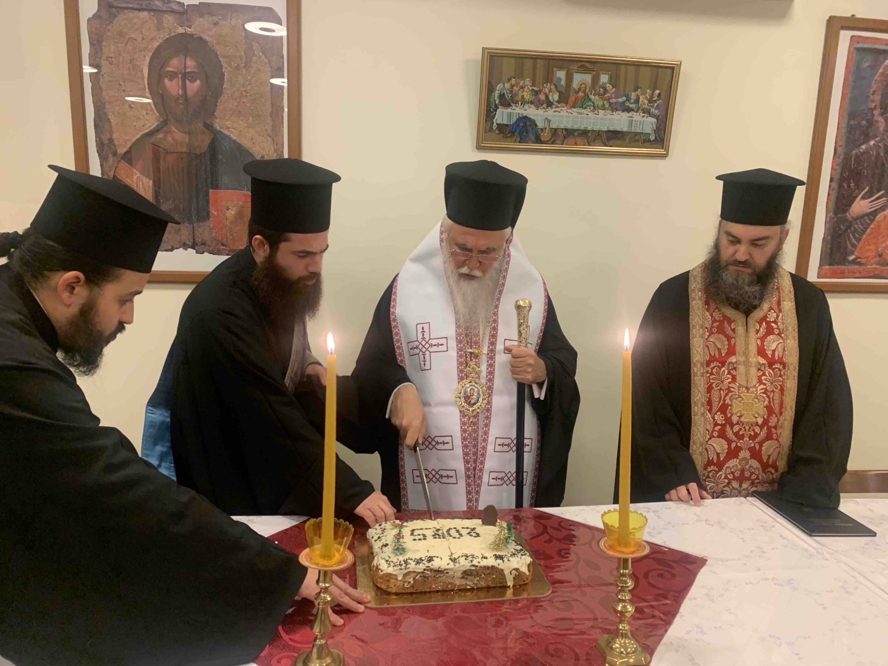 Τη Βασιλειόπιτα ευλόγησε ο Σεβ. Ποιμενάρχης μας κ. Ιερόθεος, πλαισιούμενος από τον Υπεύθυνο του Μητροπολιτικού Γραφείου Πανοσιολ. Αρχιμ. π. Κύριλλο Αλεξανδρόπουλο, τον Εφημέριο του Ιερού Ναού Αιδεσιμολ. Πρωτ. π. Σταύρο Λάδη, καθώς και τους Διακόνους της Ιεράς Μητροπόλεώς μας, οι οποίοι διδάσκουν τη ψαλτική τέχνη.