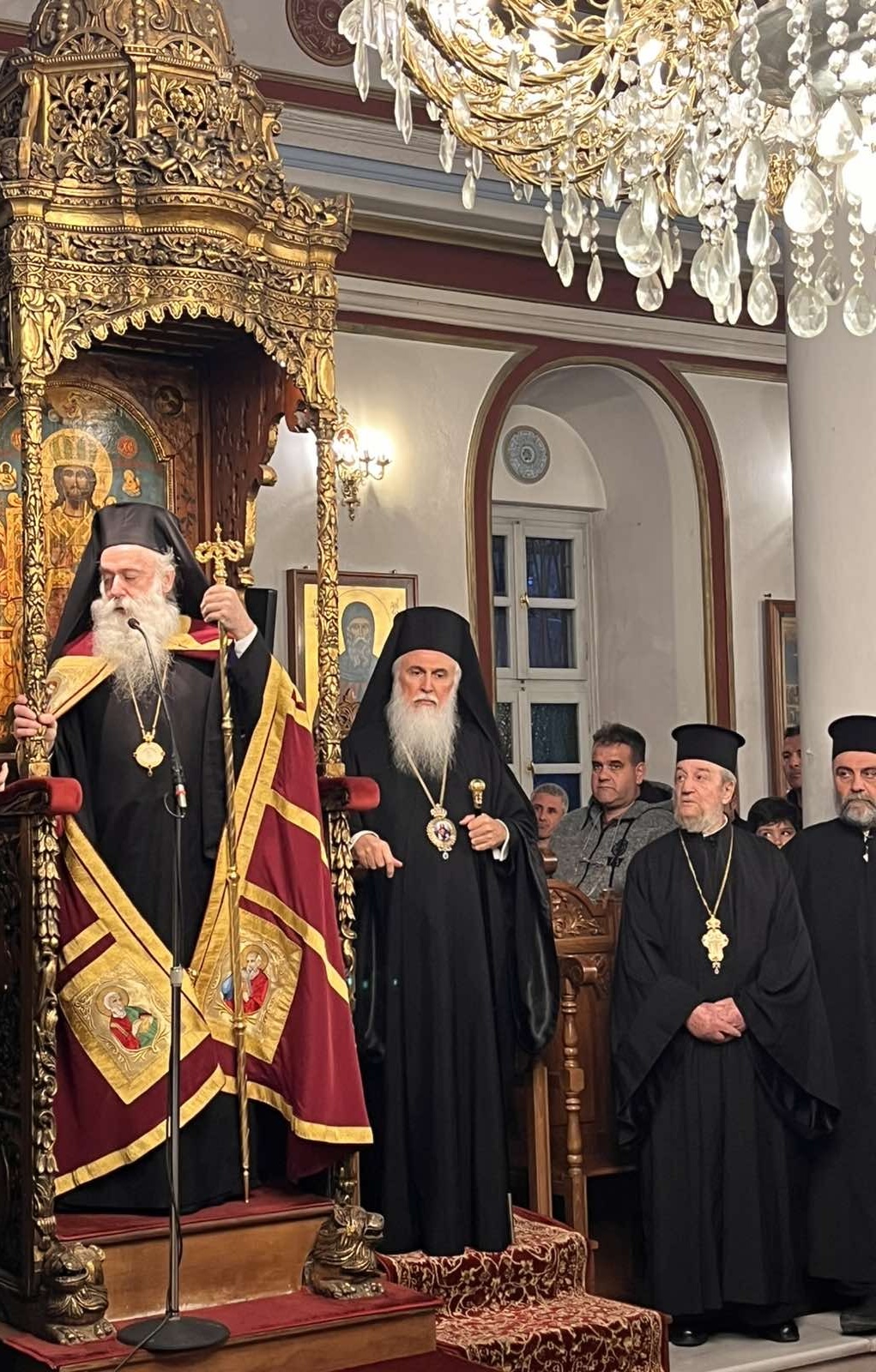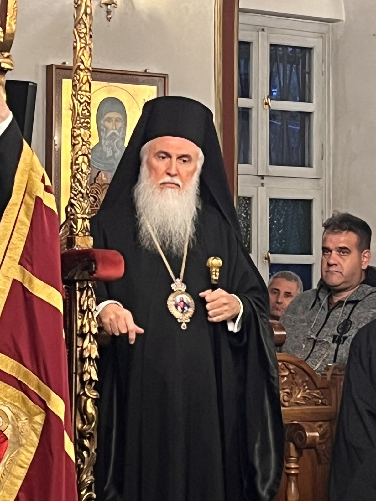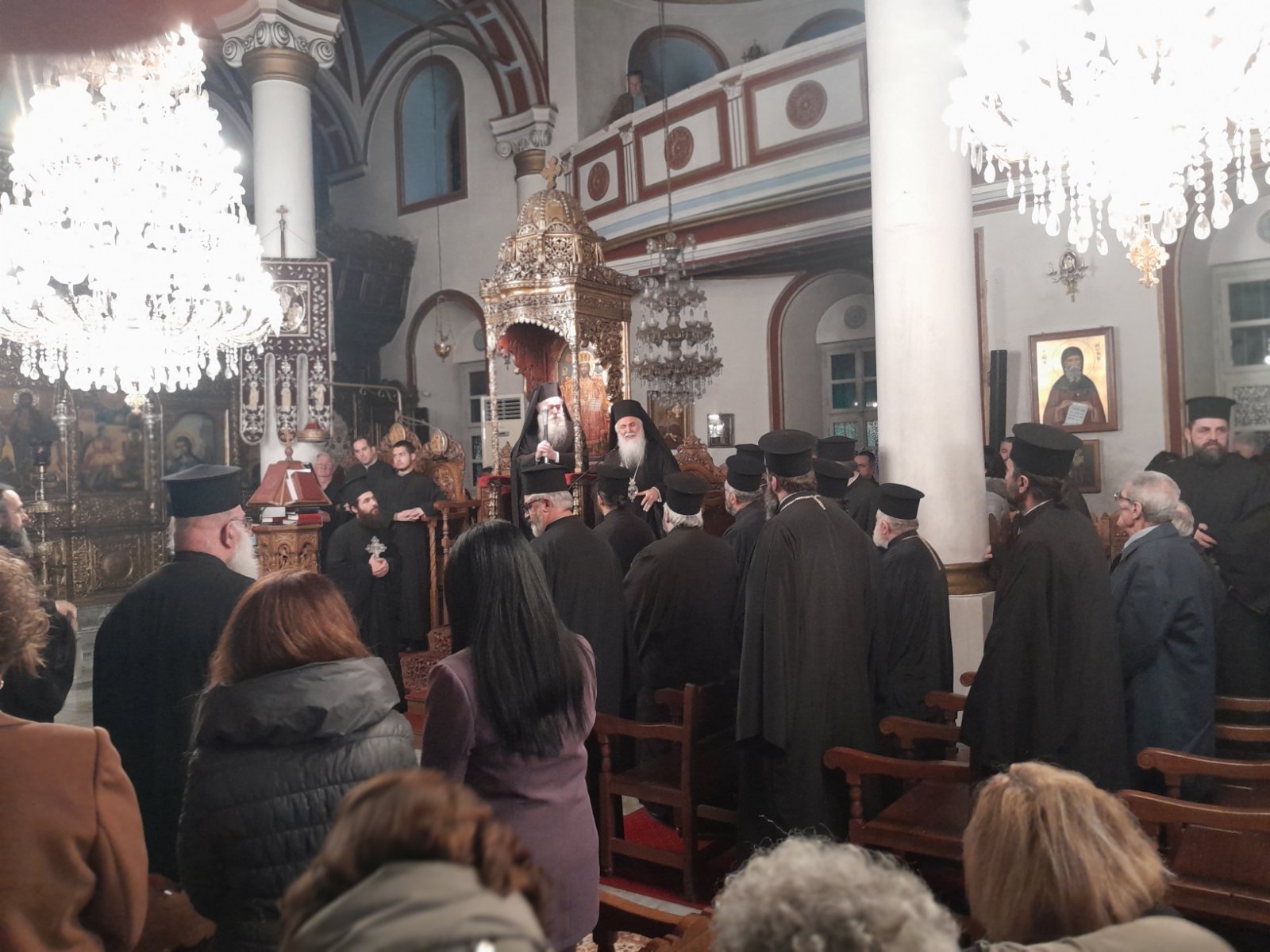 Ακολούθως, καλωσόρισε τον χοροστατήσαντα Θεοφ. Επίσκοπο Θεσπιών με θερμούς και εγκάρδιους λόγους και τον ευχαρίστησε, επειδή ανταποκρίθηκε στην φιλάδελφη πρόσκλησή του προσερχόμενος στο νησί, εκ του οποίου έλκει την καταγωγή της μητέρας του, για να ομιλήσει κατά τον Κατανυκτικό Εσπερινό της Συγχωρήσεως, με τον οποίο ανοίγει η πνευματική αυλαία της Μεγάλης Τεσσαρακοστής.