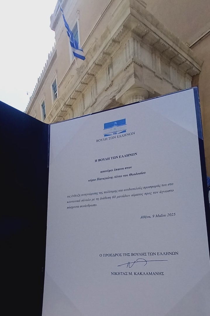 Η τελετή πραγματοποιήθηκε στην αίθουσα της Ολομέλειας της Βουλής, την Παρασκευή 9 Μαΐου 2025, στο πλαίσιο εκδήλωσης αφιερωμένης στην αναγνώριση των εθελοντών αιμοδοτών από όλη την Ελλάδα. Ο κ. Λέττος, οδηγός του υπηρεσιακού οχήματος του Μητροπολίτου μας, με πάνω από εκατό εθελοντικές αιμοδοσίες, αποτελεί φωτεινό παράδειγμα προσφοράς και κοινωνικής ευαισθησίας.