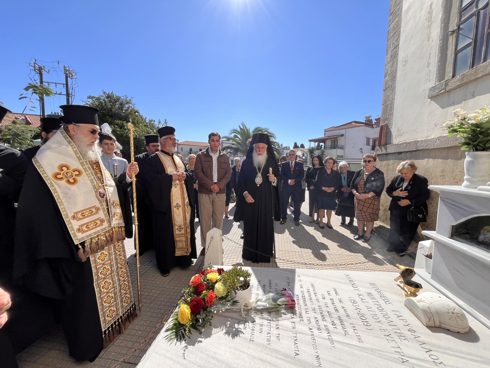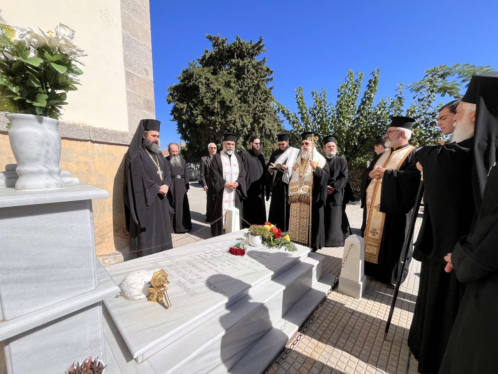 Ακολούθως, άπαντες μετέβησαν όπισθεν του Ιερού Βήματος του Ιερού Μητροπολιτικού Ναού της Αγίας Τριάδος, όπου τελέσθηκε Αρχιερατικό Ιερό Τρισάγιο επί του τάφου του μακαριστού Μητροπολίτου Λήμνου και Αγίου Ευστρατίου κυρού Ιεροθέου Β’ (Γαρυφάλλου), ο οποίος επί 31 συναπτά έτη εποίμανε, με σύνεση και φιλοτιμία, την Τοπική Εκκλησία, αγωνιζόμενος για την κατά Θεόν προκοπή και τη σωτηρία του ποιμνίου του.