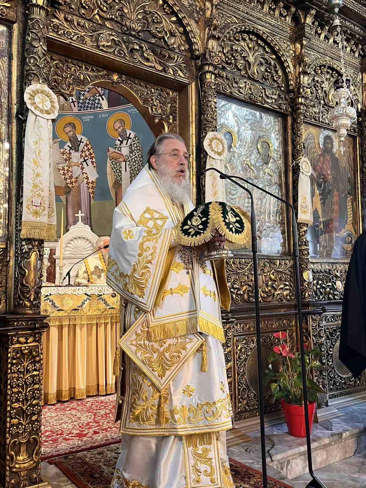 Στο εμπνευσμένο κήρυγμά του, ο Σεβ. κ. Κύριλλος αναφέρθηκε διδακτικά στο πρόσωπο του τιμωμένου Αγίου, συνδέοντας τα χαρακτηριστικά της επίγειας βιοτής και πολιτείας του με την αποστολή και ευθύνη που κληρονομεί κάθε Επίσκοπος της Εκκλησίας. Ειδική μνεία έκανε, επίσης, στους περίφημους εγκωμιαστικούς λόγους, τους οποίους συνέθεσε η θεόπνευστη γραφίδα του Αγίου Διονυσίου του Αρεοπαγίτου προς τιμήν του διδασκάλου του, Αγίου Ιεροθέου, ενώ, αφορμώμενος από το Αποστολικό ανάγνωσμα, περιέγραψε συνοπτικά το ιοστεφές άστυ των Αθηνών κατά την εποχή του Αποστόλου Παύλου και επισήμανε ότι ο τιμώμενος Άγιος τόλμησε να μιλήσει στη γλώσσα της εποχής του και των ανθρώπων της, μάλιστα μέσα σε ένα ειδωλολατρικό και κοσμοπολίτικο περιβάλλον.