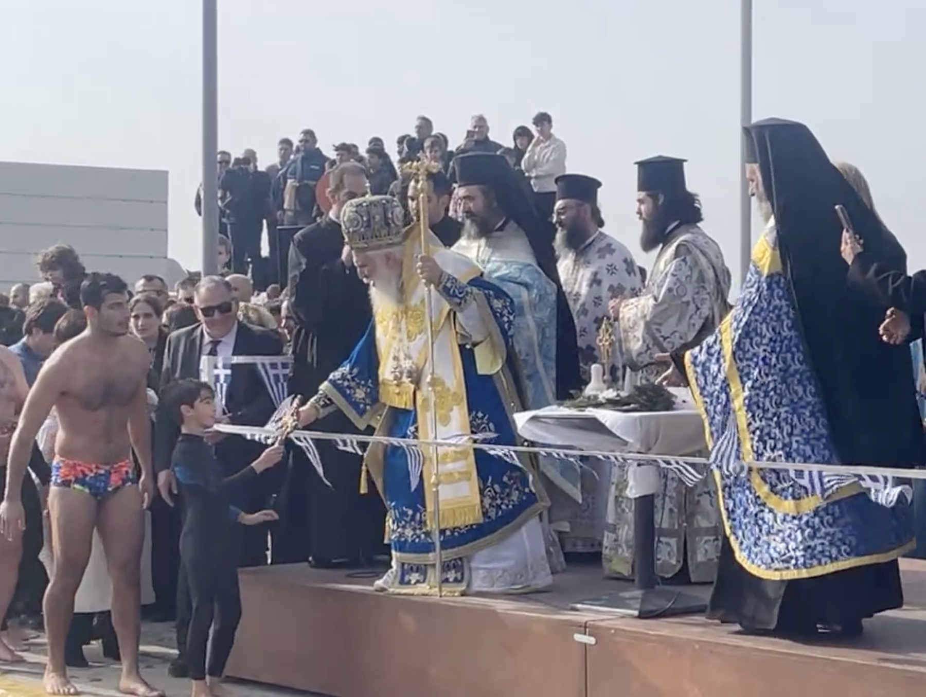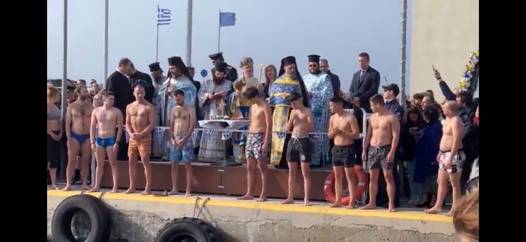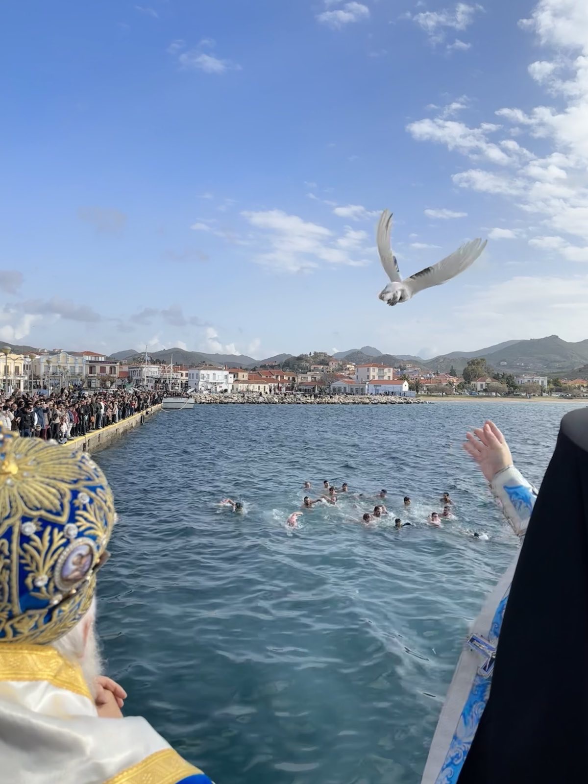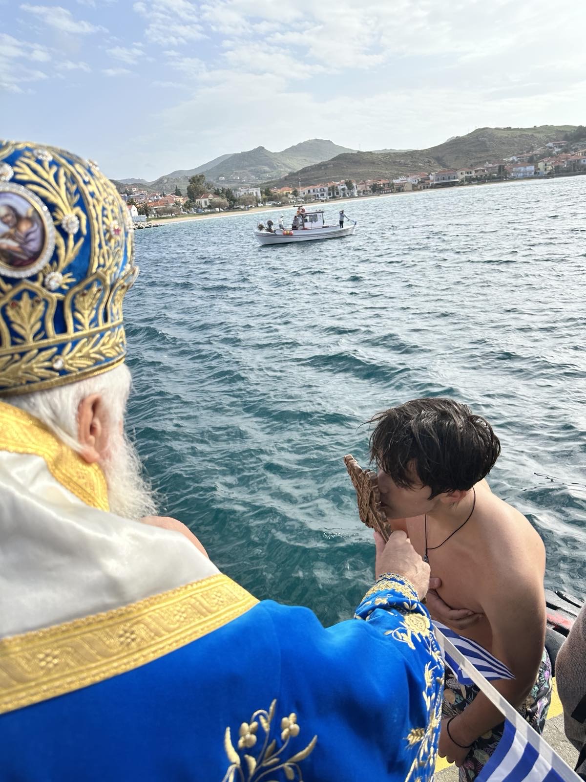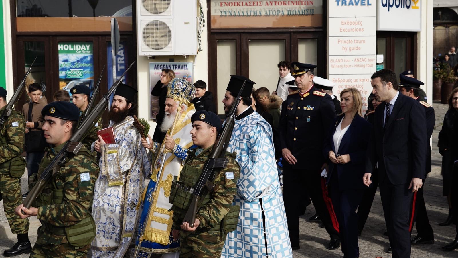 Με το άκουσμα του λαοφίλητου απολυτικίου της εορτής «Ἐν Ἰορδάνῃ βαπτιζομένου σου Κύριε», το σημαιοστολισμένο σκάφος του Λιμενικού Σώματος, από κοινού με τα ελλιμενισμένα καΐκια και τις βάρκες, απέδωσε τις προσήκουσες τιμές, ενώ οι στρατιώτες, με στεντόρεια φωνή και εθνική υπερηφάνεια, έψαλαν τον Εθνικό Ύμνο, δημιουργώντας μια μοναδική αίσθηση ιερότητας και συγκίνησης.