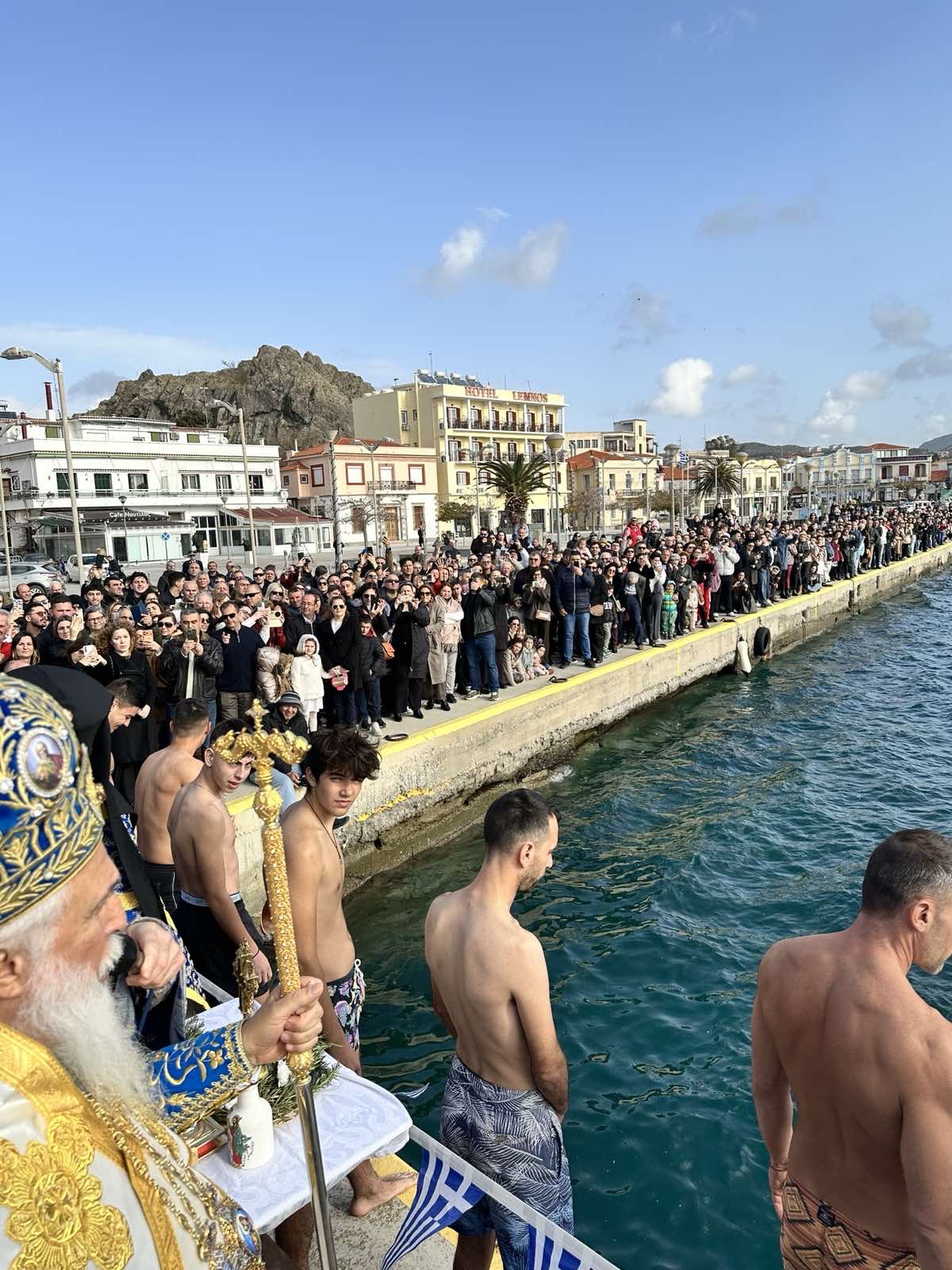 Ακολούθως, πληθύς λαού, προπορευομένου στρατιωτικού αγήματος, συνόδευσε λιτανευτικά, μέσω της κεντρικής Αγοράς της πόλεως, τον Τίμιο Σταυρό και την ιερά εικόνα της Βαπτίσεως του Κυρίου, φερομένης επί των ώμων ευλαβών χριστιανών, και κατευθύνθηκε στον παλαιό και γραφικό λιμένα της Μύρινας, η προκυμαία του οποίου ήταν κατάμεστη από τον λαό του Θεού, όπου, υπό την σκιά του ενετικού Κάστρου, πραγματοποιήθηκε με κάθε επισημότητα ο καθαγιασμός των υδάτων.